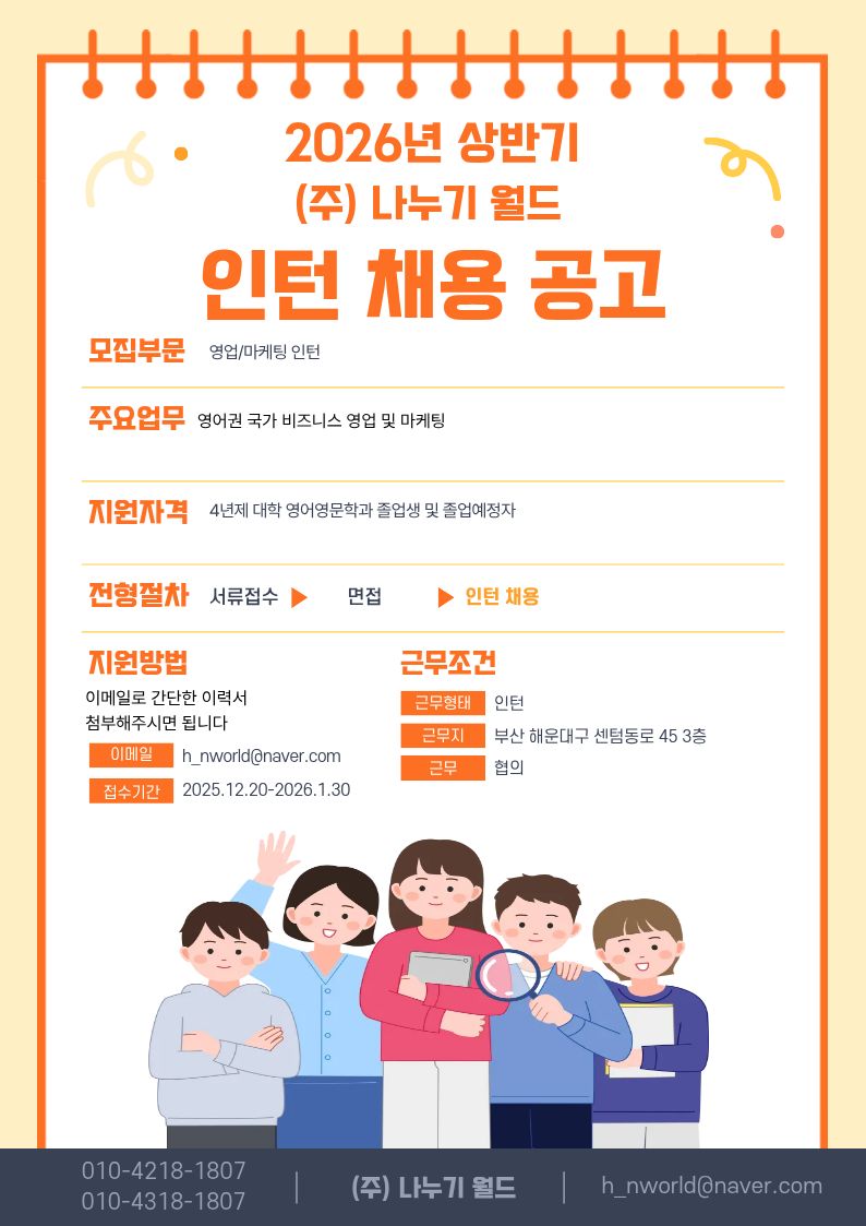 안녕하세요. 저희는 주식회사 나누기월드이며, 현재 인턴 채용을 진행 중에 있어 메일 드립니다.