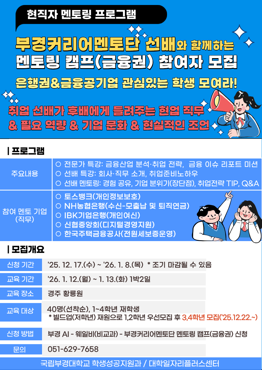 진로·취업 전문가 특강과 금융권 현직자 선배의 진로설계경험·취업성공사례·현업 직무특성 등 공유하는 「부경커리어멘토단 멘토링 캠프:금융권」을 운영하니 관심있는 학생들이 참여할 수 있도록 홍보해 주시기 바랍니다. ○ 프로그램: 부경커리어멘토단 멘토링 캠프(금융권) ○ 운영기간: 2026. 1. 12.(월) ∼ 1. 13.(화) 1박2일 숙박형 ○ 교육장소: 황룡원 경주 ○ 모집기간: 2025. 12. 17.(수) ∼ 2026. 1. 8.(목) 선착순 모집 ※ 조기 마감될 수 있음 ○ 모집대상 및 인원: 1∼4학년 재학생, 40명 ※ 재맞고 빌드업(저학년) 재원임에 따라 1, 2학년 우선모집 후 3, 4학년 확대모집(’25.12.22.부터) ○ 교육일정 및 내용
