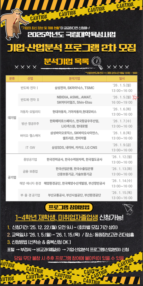가. 교육내용: 산업별 주요 기업과 지역 기반 우수기업에 대한 이해를 높이고, 실질적인 취업 기회를 확보할 수 있도록 정보 제공 및 탐색 방법을 지원함.(회차별 3H, 대면 교육) [붙임] 참조 나. 지원자격: 1~4학년 재적생, 미취업졸업자 다. 신청기간: 2025. 12. 22.(월) 9:00 ~ 2026. 1. 11.(일) 23:59 까지 (회차별 모집 기간 상이) 라. 신청방법: 포털시스템 ⇒ 부경AI ⇒ 비교과(웨일비) ⇒ 기업·산업분석 프로그램(회차) |