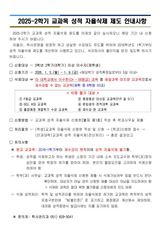 | 첨부파일 | 1. 2025-2학기 교과목 성적 자율삭제 시행 안내문.pdf 2. 교과목 성적 자율삭제 신청원.hwpx 3. 교과목 성적 자율삭제 운영지침(20250605).hwpx | ||