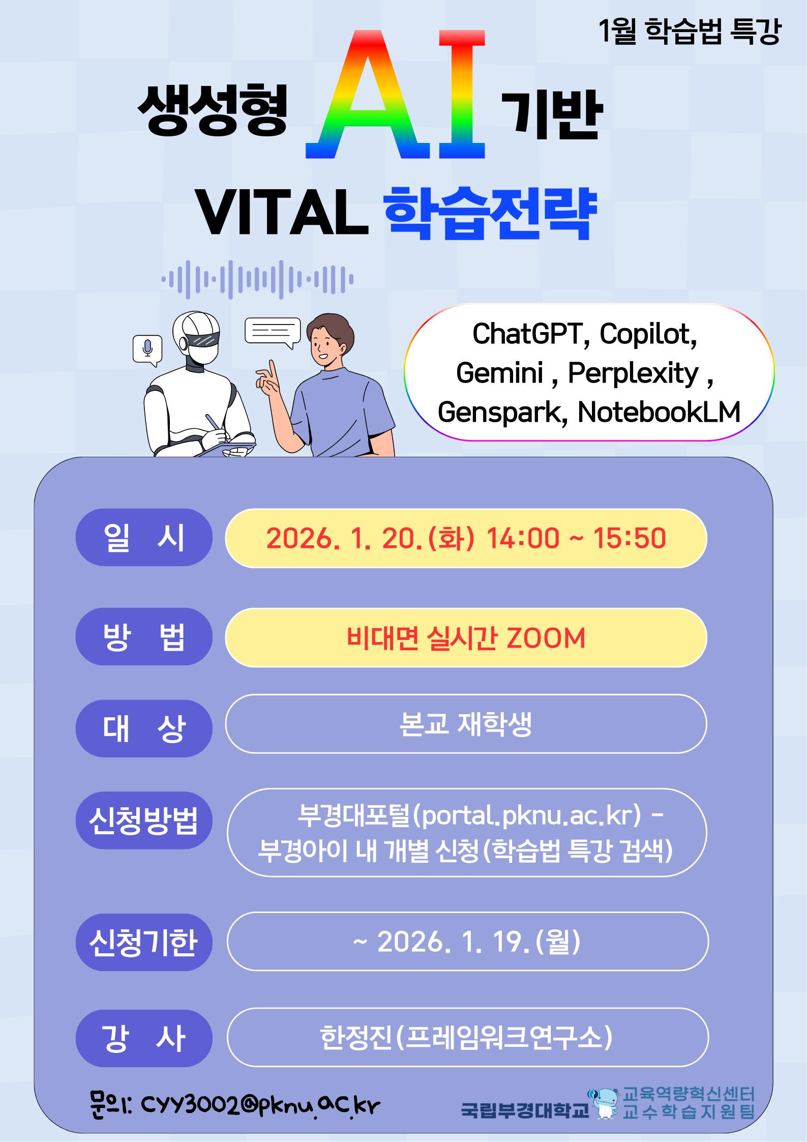 2026학년도 1월 학습법 특강을 아래와 같이 실시하오니, 단과대학 및 학부(과)에서는 관심있는 학부 재학생이 참가할 수 있도록 적극 안내하여 주시기 바랍니다. 가. 일 시: ’26. 1. 20.(화) 14:00 ~ 15:50 나. 방 법: 비대면 실시간 ZOOM 다. 참여대상: 본교 학부 재학생 라. 신청방법: 부경대포털(portal.pknu.ac.kr) - 부경AI 접속 후 개별 신청 마. 신청기한: ~ ’26. 1. 19.(월) 바. 특강주제: 생성형 AI 기반 VITAL 학습전략 사. 강 사: 한정진(프레임워크연구소 대표)