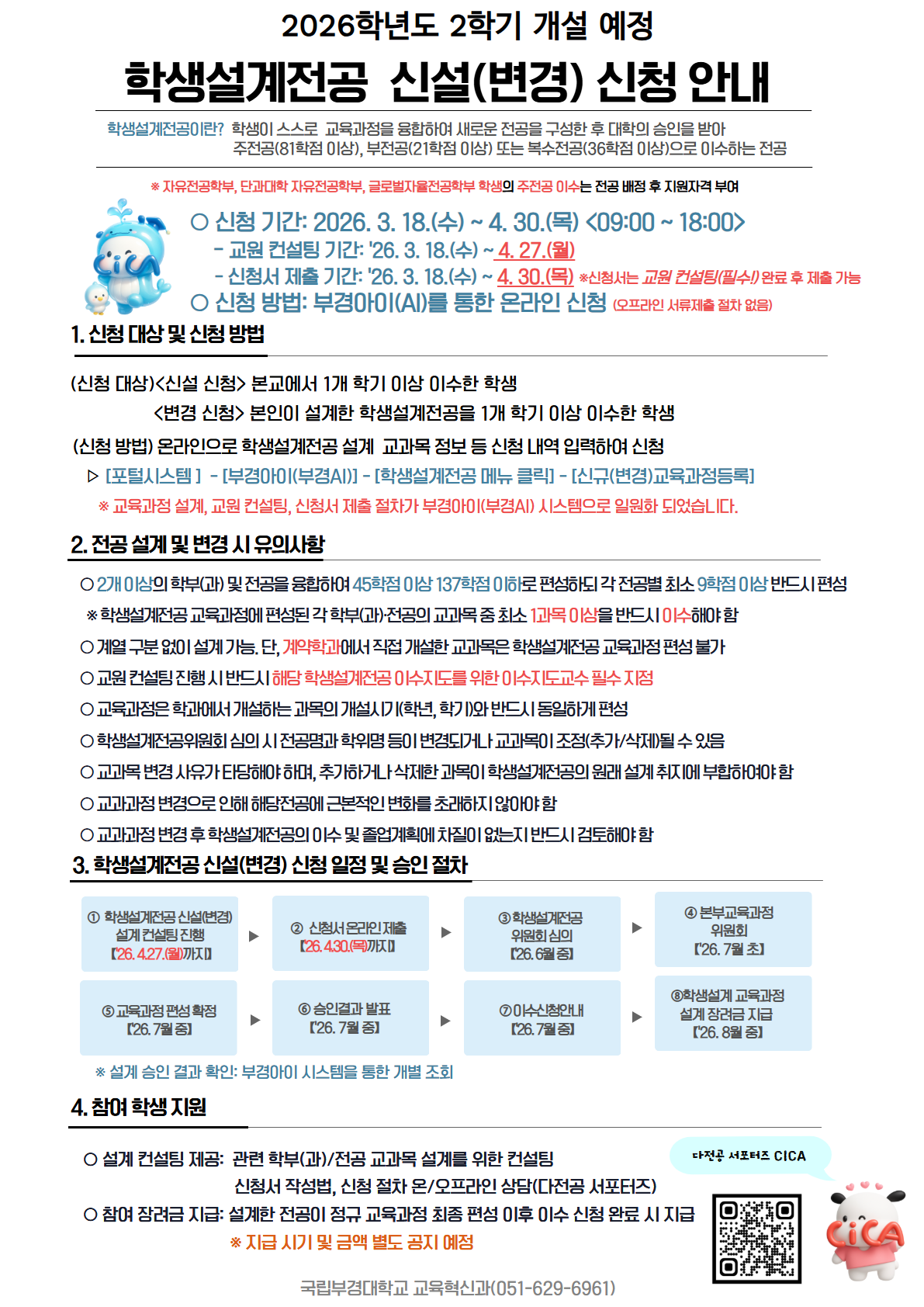 | 첨부파일 | 2-1. 부경AI 학생설계전공(학생가이드).pptx 3. 국립부경대학교 다전공 설치 및 운영에 관한 지침(2026.02.26.).hwp | ||