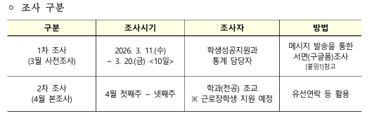 2025년 고등교육기관 졸업자 취업통계조사 업무지원 근로장학생을 모집합니다. 1) 근로기간: 학과 사무실과 조율, 최대 20시간 근로 가능 (시급 10,320원) 2) 선발기준: 직전학기 평점평균 1.75이상, 장학금 지급일 기준 재학생이어야 함 3) 선발제외자: 근로장학생(국가근로, 대학행정인턴), 멘토링(자유전공학부 전공탐색, 대학생청소년교육지원사업, 대학생튜터링 등), 학사학위취득유예자, 초과학기자(수업연한경과자), 휴학생, 대학원생 4) 근로장학생 근무상황부 제출: 2026. 4. 24.(금)까지(예정) 5) 장학금 지급일: 2026. 6월 중 6) 지원을 희망하는 학생은 근무가능시간과 근무경력(알바 경력)을 작성하여 3월 22일까지 sb133961@pknu.ac.kr로 연락 주시기 바랍니다. 주요 근무 내용은 2차 조사 기간에 졸업생들을 대상으로 연락하여, 조사 항목에 맞추어 졸업통계를 내는 것 입니다.