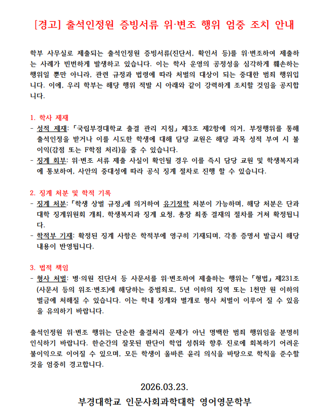 ★★[경고] 출석인정원 증빙서류 위·변조 행위 엄중 조치 안내